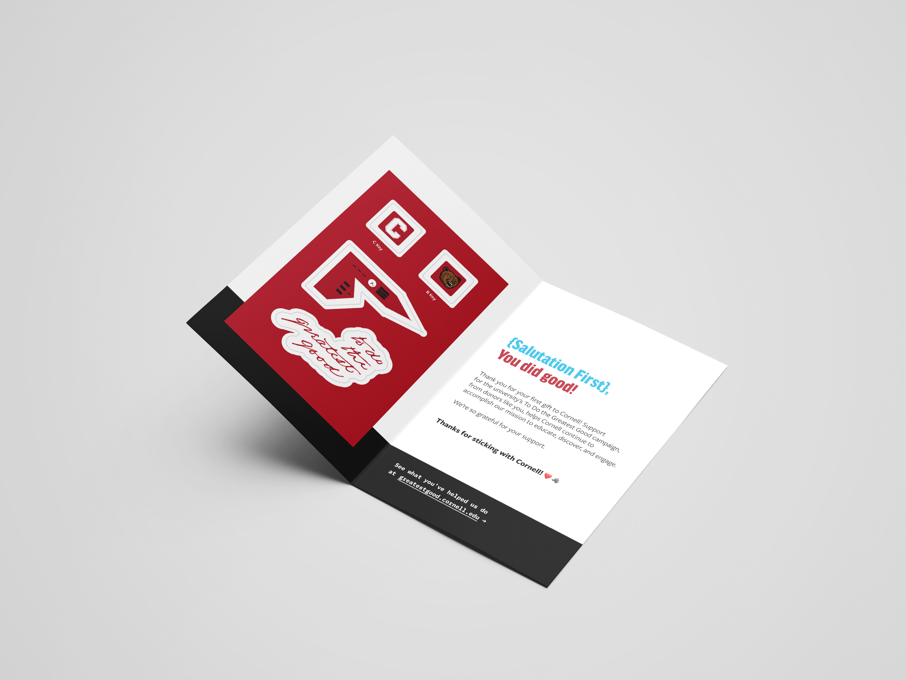This suite consisted of a series of creative stewardship pieces celebrating loyal annual donors. It began with a new donor sticker postcard to thank them for taking that first step, followed by a welcome mailing featuring a custom pennant for those who had met the requirements to join the society. Continued support is recognized through a Cornell key tag mailing and socks inspired by the story of Ezra Cornell’s socks going to space. Each piece was designed to surprise and delight donors while reinforcing their connection to Cornell and the impact of their ongoing generosity.