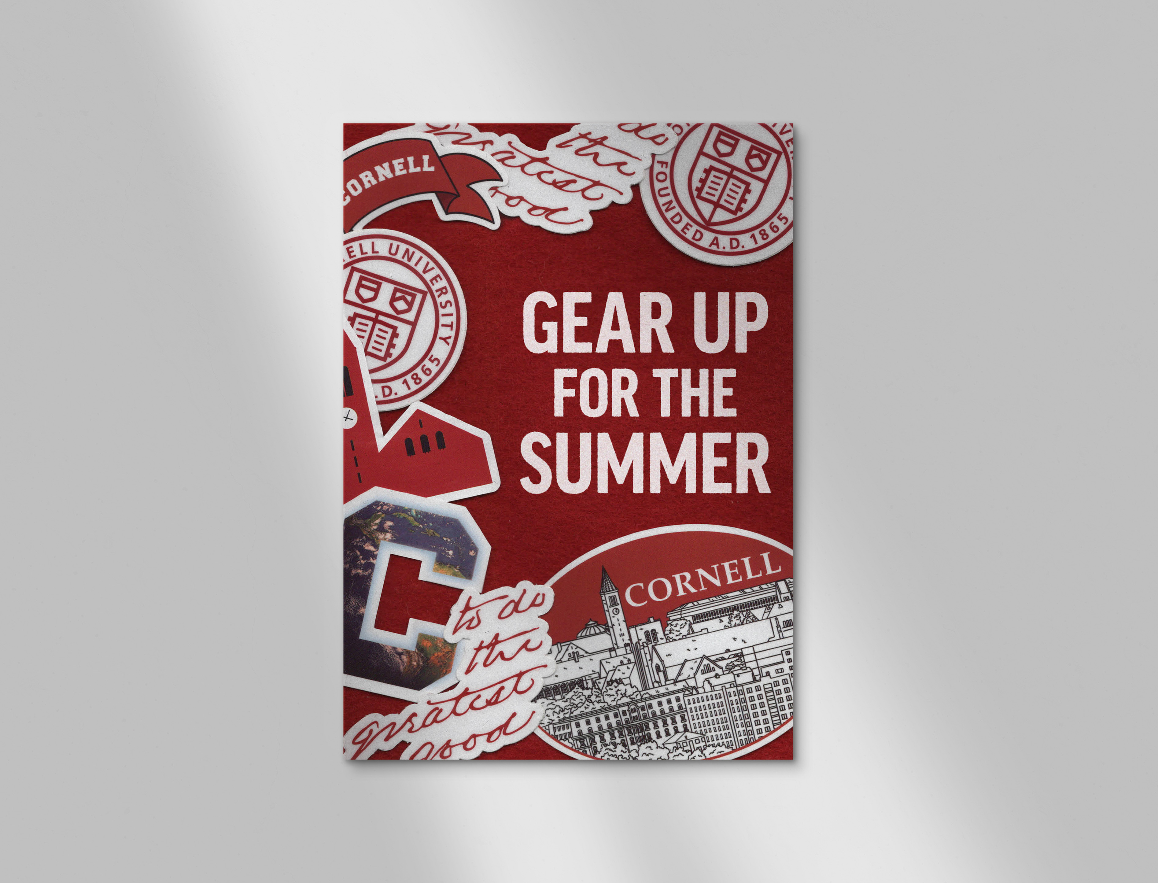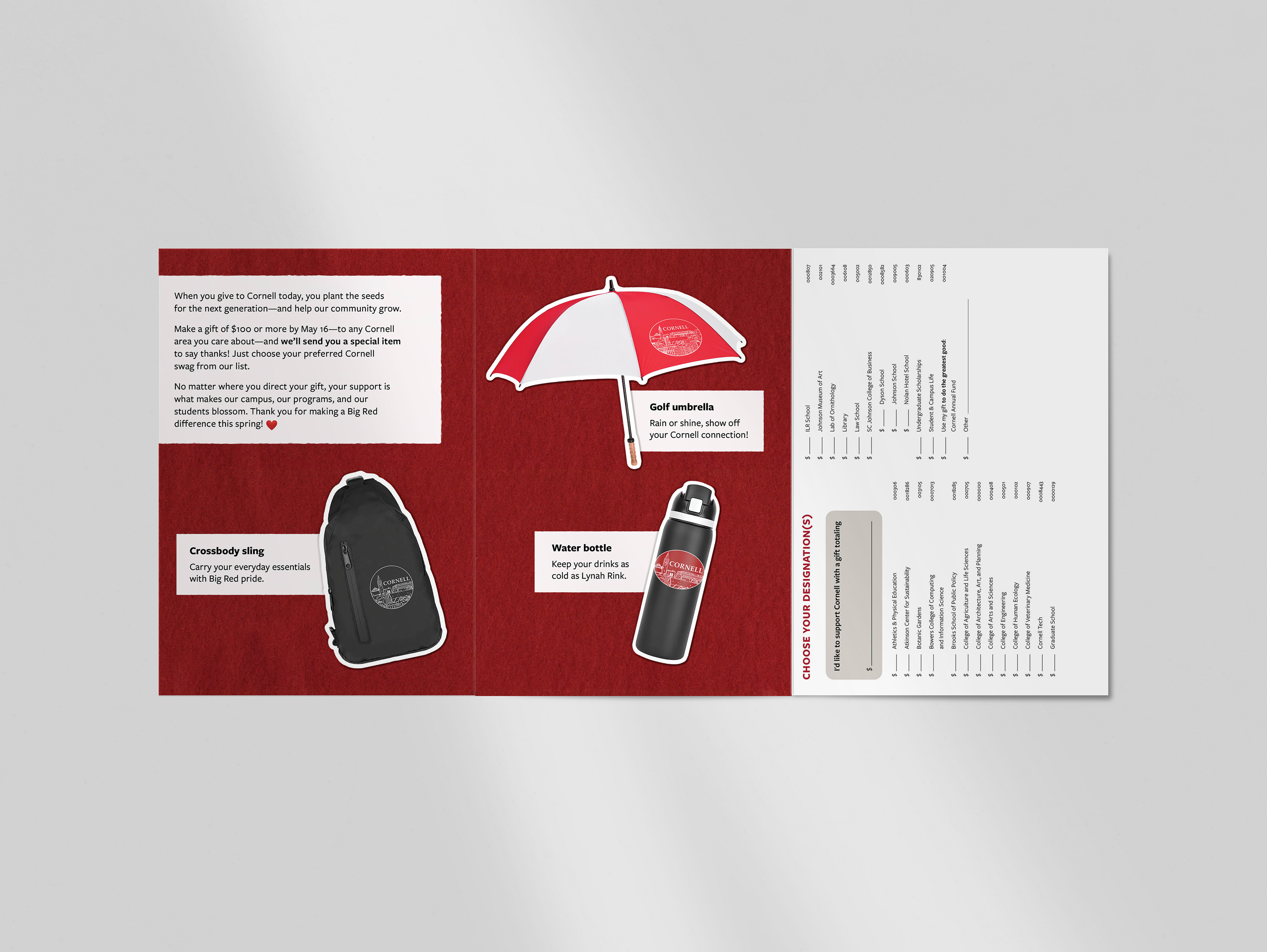 For Cornell, Sarina Alexander designed a “Give to Get” direct mail campaign centered on a tri-fold self-mailer that immediately engaged recipients with vibrant artwork and real-texture details. The mailer included a tear-off pledge card, making participation seamless and interactive. She also designed the three featured gifts—a sleek water bottle, a versatile crossbody bag, and a stylish umbrella—ensuring each item felt thoughtful and desirable. The project combined tactile design, compelling visuals, and cohesive product design to drive excitement and participation in the campaign.